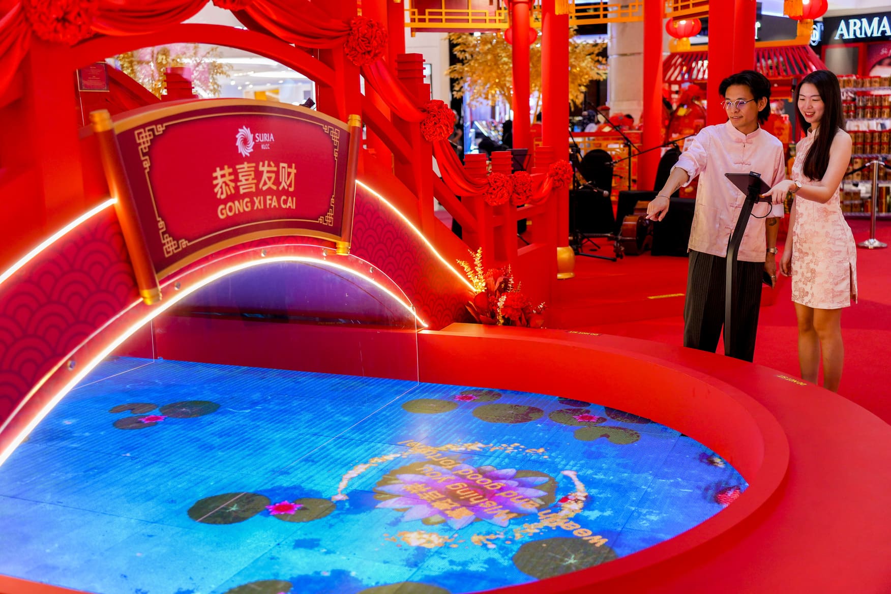 A picturesque bridge spans over an interactive digital koi pond, where shoppers can select their wishes and see them beautifully displayed on the pond. Adding to the enchanting atmosphere, the Gold Blossoming Tree of Prosperity stands proudly in the garden, symbolising abundance and prosperity for all.